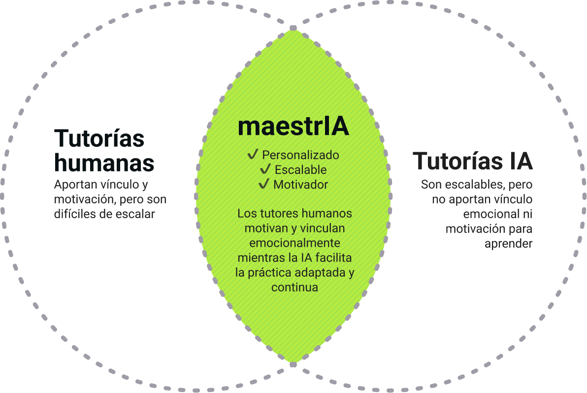 maestrIA ofrece un modelo híbrido: los tutores motivan al alumno y la IA facilita la práctica autónoma y adaptada a su nivel, aumentando la eficiencia de las tutorías.