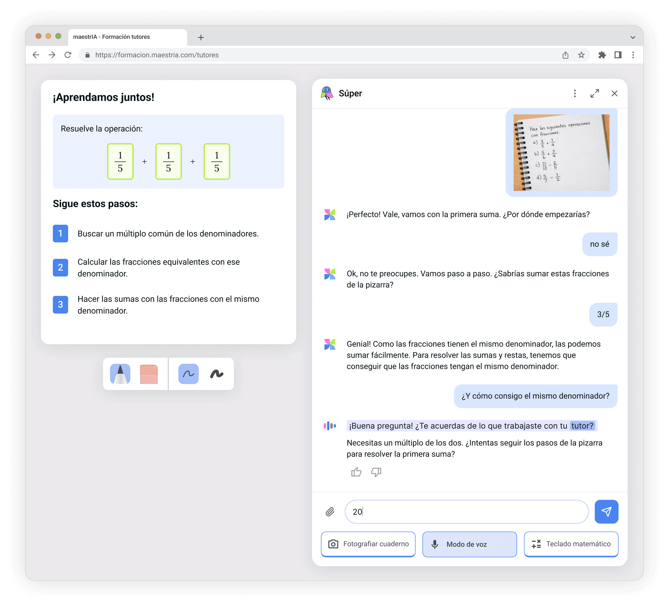 El tiempo del tutor humano es limitado, el de Súper no. Nuestro tutor con inteligencia artificial acompaña al estudiante, ofreciéndole práctica personalizada y adaptada a su nivel.